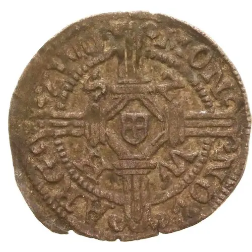 | Mô tả mặt trước | Thick cross with city arms in diamond at center and large letter in each corner, dividing inner beaded circle and legend. |