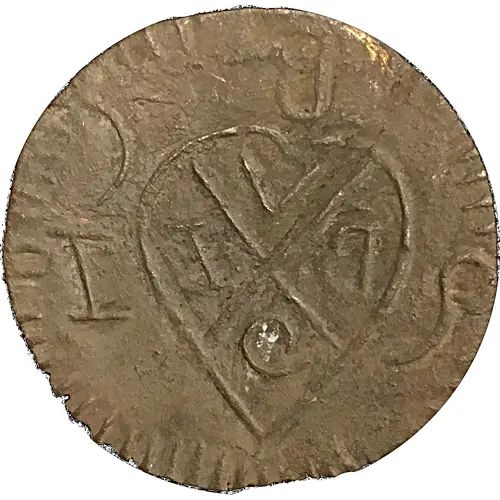 | Reverse description | This prominent reverse shows a nicely mirrored crude imitation of an 1813 1/2 Stuiver. The `2` at the bottom is actually a reversed crude Z. |