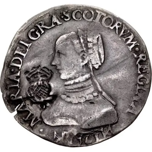 Reverse description Crowned arms of Mary as Queen of Scotland and Queen Dowager of France. Crowned `M` to either side of the arms. Countermarked with a crowned thistle.