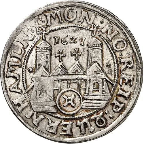 | Obverse description | Church with 2 towers, date between towers, city arms in entrance below. |