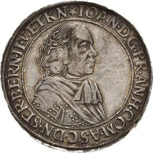 IOAN. D. G. PR. ANH. COM. ASC. DN. SER. BERN. IEV. ET KN. (Translation: John, by the Grace of God, prince of Anhalt, count of Ascania, lord of Zerbst, Bernburg, Jever and Kniphausen.) |
