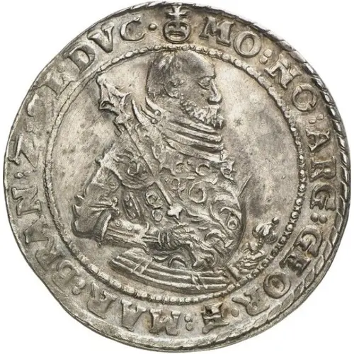 | Reverse description | Coat of arms of the Teutonic Order (floriated cross formed by four pillars with eagle on escutcheon in the center). In the four quadrants divided by the cross, the coat of arms of Georg Friedrich split on German escutcheons, clockwise: quartered sable and argent Hohenzollern arms, crowned rampant lion of Ansbach, Griffin of Pomerania, Red Eagle of Brandenburg. Legend around a beaded inner circle, start 1h with date divided by mintmark at the end. |