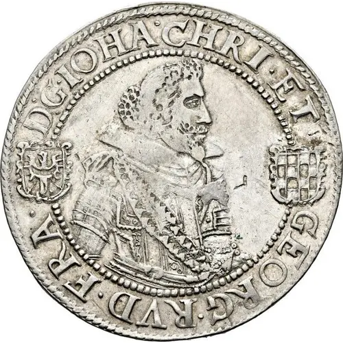 Armored and draped bust of Johann Christian right, legend begins at 10h, divided by 2 small shields of arms of Brieg and Liegnitz at left and right. |