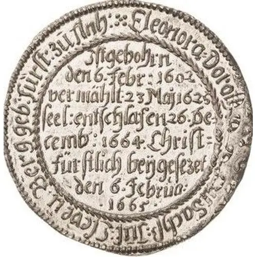 | Obverse lettering | Eleonora Dorothea Herz zu Sachs Jün Eledeu Berg geb Fürst zu Anhalt Ist geborn den 6 Febr 1602 vermählt 23 Mai 1625 seel entschlafen 26 De cemb 1664 Christ fürstlich beijgeset den 6 Februa 1665 |