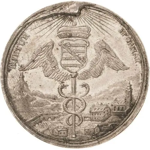| Obverse description | Winged cadeuceus surmounted with crowned arms of Saxony, view of Jena in background, rays streaming from sun above, legend at sides |
