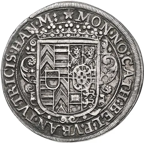 | Beschrijving voorzijde | Crowned arms of Hanau-Munzenberg and Nassau-Orange in ornamented shield, titles of Katharina Belgia. |