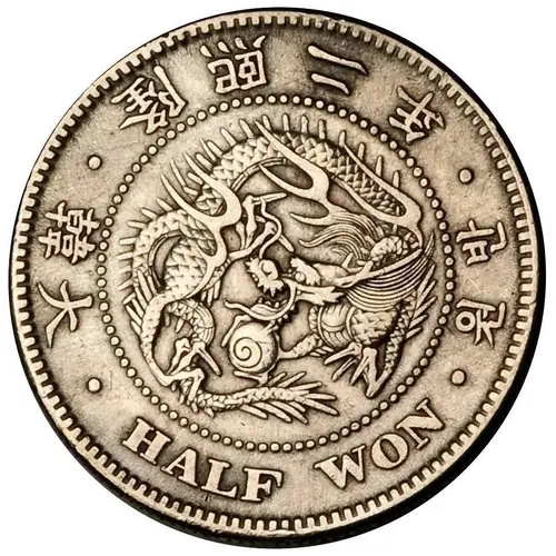 | Légende de l’avers | • 大韓 • 隆熙二年 • 반원 • HALF WON (Translation: Great Korea, 2nd year of Yung Hee, Half Won) |