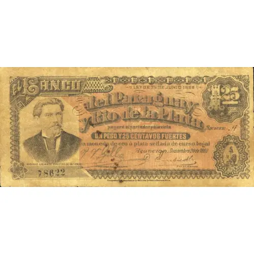 | Obverse lettering | LEY DE 25 DE JUNIO DE 1889. El Banco del Paraguay y Rio de la Plata pagará al portador y á la vista UN PESO Y 25 CENTAVOS FUERTES en moneda de oro ó plata sellada de curso legal. Asunción, Diciembre 26 de 1889. (Translation: Law of June 25th., 1889. The Bank of Paraguay and Silver River Will pay to bearer, at sight, One Peso & 25 cents Fuertes in coins of gold or sealed silver, of legal tender. Asunción, December 26th., 1889.) |