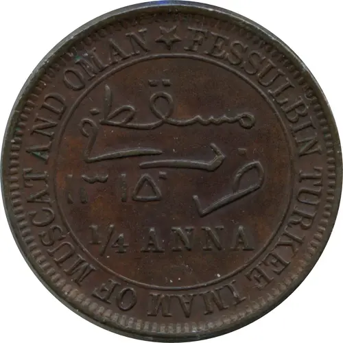 | Légende de l’avers | ★ FESSULBIN TURKEE IMAM OF MUSCAT AND OMAN مسقط ضرب في ١٣١٥ 1/4 ANNA (Translation: Fessul bin Turkee (Faisal bin Turki), Imam of Muscat and Oman Struck in Muscat 1315 1/4 Anna) |