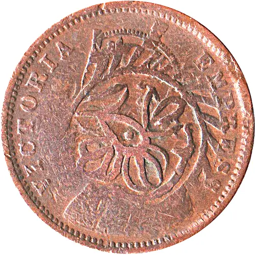 Design stamped over top of Queen Victoria`s youthful portrait. Struck over British India - 1/4 Anna - KM#486. |