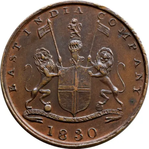 | Obverse description | Coat of arms of the East India Company: 2 lions, St George`s cross on the crest and flags, motto on the ribbon `Auspicio Regis et Senatus Angliæ`. Name of the issuer around, date at the bottom. |