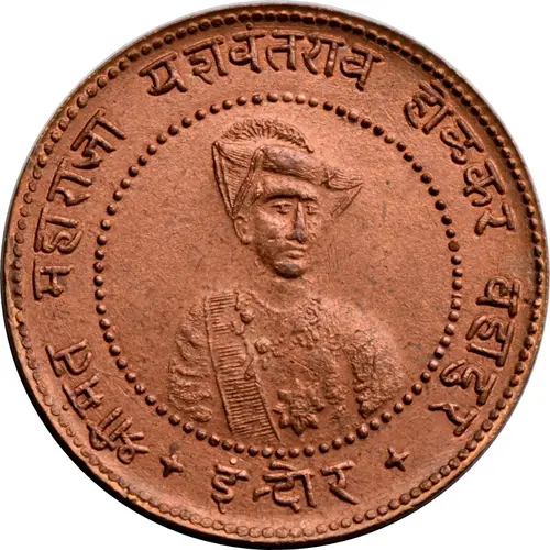 | Obverse description | Maharaja Yashwant Rao II Holkar, bust facing three quarters right within beaded circle Lettering in Devnagari outside circle |