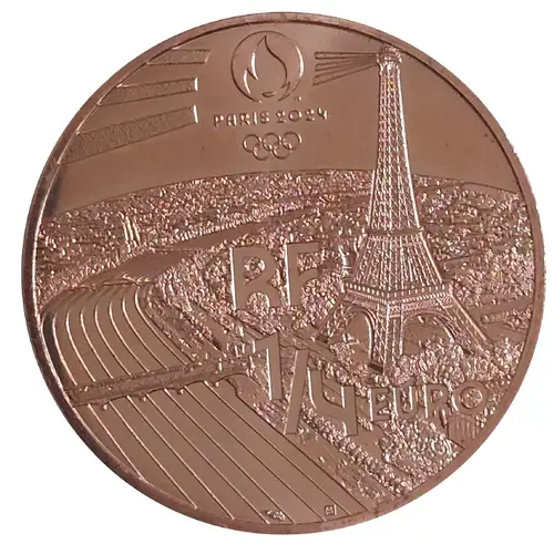 Under the logo of the Paris 2024 Paralympic Games. A view of Paris. The Eiffel Tower is posed in front of the Seine stylized as an athletics track. |