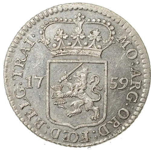 MO : ARG : ORD : FOED : BELG : TRAI 17 59 (Translation: Silver coinage of the State of Utrecht of the United Provinces of the Netherlands) |