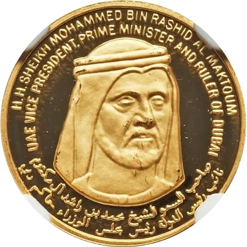 Head of Sheikh Mohammed bin Rashid Al Maktoum facing right, with Arabic and English legends giving his name and titles |