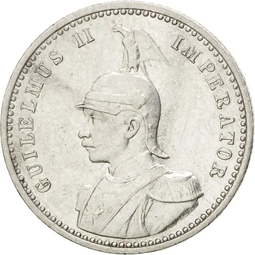 | توضیحات روی سکه | Bust of William II in military uniform facing right and wearing the Prussian helmet topped by a crowned Hohenzollern eagle. |