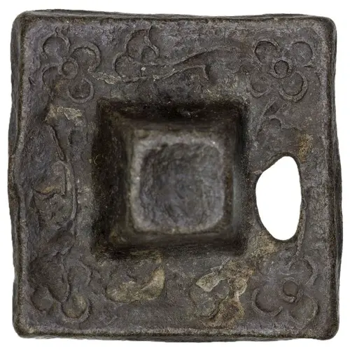 This `coin` has the shape of a four-sided pyramid with a peak in the middle. The peak is surrounded by a floral pattern on the plinth/ledge. There is a hole at one of the sides. The peak is about 5-6 millimeters high. |
