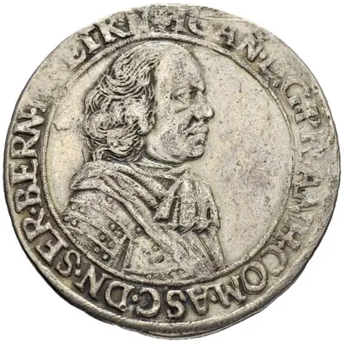 IOAN. D. G. PR. ANH. COM. ASC. DN. SER. BERN. IEV. ET KN. (Translation: John, by the Grace of God, prince of Anhalt, count of Ascania, lord of Zerbst, Bernburg, Jever and Kniphausen.) |