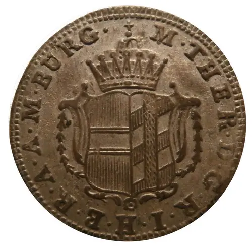 | Beschrijving voorzijde | Crowned coat of arms, part of Austria and part of Burgau (Günzburg). legend around for `Maria Theresia Dei Gratia Romanorum Imperatrix Hungariae Bohemiae Regina Archidux Austriae Margravius Burgoviae` |