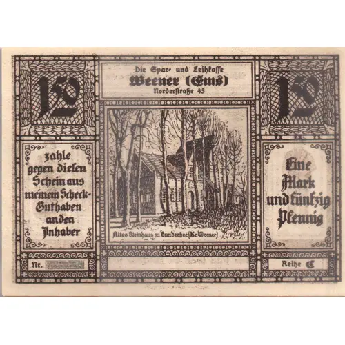 Die Spar und Leihkasse Weener (EMS) Norderstrasse 45 zahle gegen disen Schein aus meinem Scheck-Guthaben anden Anhaber Eine Mark und Fünfzig Pfennig Reihe C (Translation: The Spar und Leihkasse Weener (EMS) Norderstrasse 45 pay against this note from my check balance to the owner One Mark and 50 Pfennig Row C) |