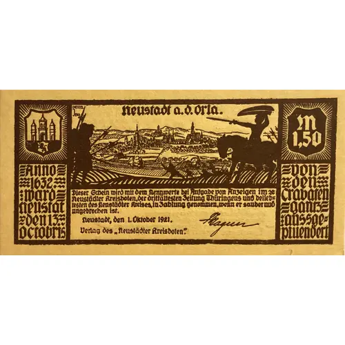 Lettering (regular font): Neustadt a.d.Orla Dieser Schein wird mit dem Nennwerte bei Ausgabe von Anzeigen Im Neustädter Kreisboten,der drittältesten Zeitung Thüringens und beliebtesten des Neustädter Kreises,in Zahlung genommen,Wein er sauber wird angebrochen ist. Neustadt,den 1.Oktober 1921 Verlag des”Neustädter Kreisboten” ANNO 1632 WARD NEUSTAT DEN 13 OCTOBRIS VON DEN CRABATEN GANTZ AUSSGEPILLENDERT |