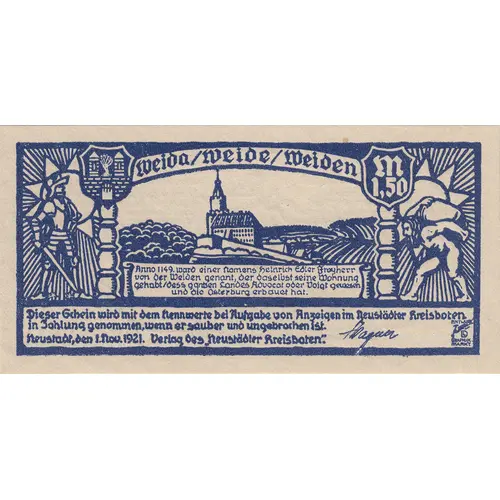 | Obverse description | Weida / Weide / Weiden M 1,50 |