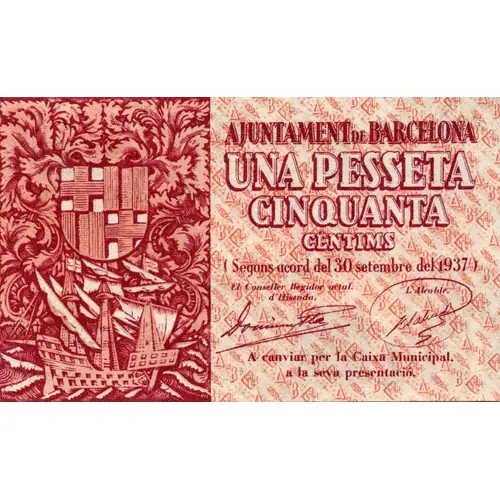 AJUNTAMENT DE BARCELONA UNA PESSETA CINQUANTA CÈNTIMS (Segons acord del 30 setembre del 1937) A canviar per la Caixa Municipal a la seva presentació. (Translation: City Council of Barcelona One Peseta Fifty Centimos (According to agreement of September 30, 1937) To be exchanged for the `Caixa Municipal` in its presentation.) |
