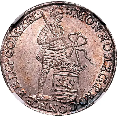 | Descrição do anverso | Knight in armor standing to right, holding sword in right hand against shoulder and ribbon in left hand, a crowned shield with arms of Zeeland at his feet. |