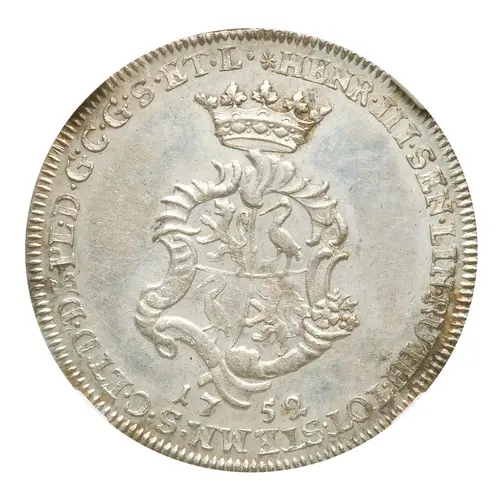 Quartered coat-of-arms within fanciful frame with crown above and date below, separated 17 and 52. Quartered coat-of-arms contains animal figures of cranes and lions. Lettering follows the round edge of the coin separated by dots. |