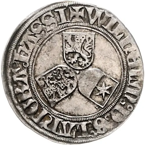 | Obverse description | 3 small shields of arms, bottom pointing to center in trefoil shape, legends in Gothic letters. |