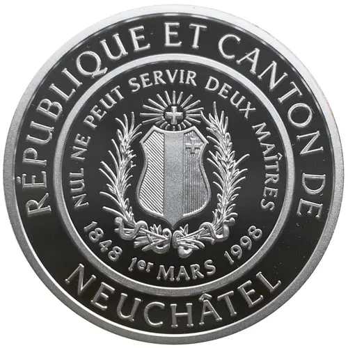 | Obverse lettering | RÉPUBLIQUE ET CANTON DE NEUCHÂTEL NUL NE PEUT SERVIR DEUX MAÎTRES 1848 1er MARS 1998 |