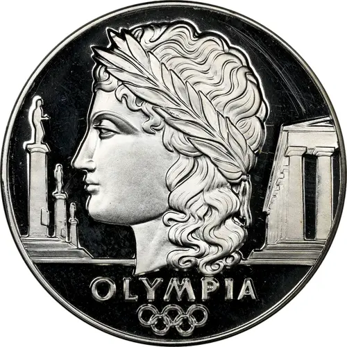 | Opis awersu | Laureate Greek head left, columns with statues at left, Parthenon on the right Olympic rings below |