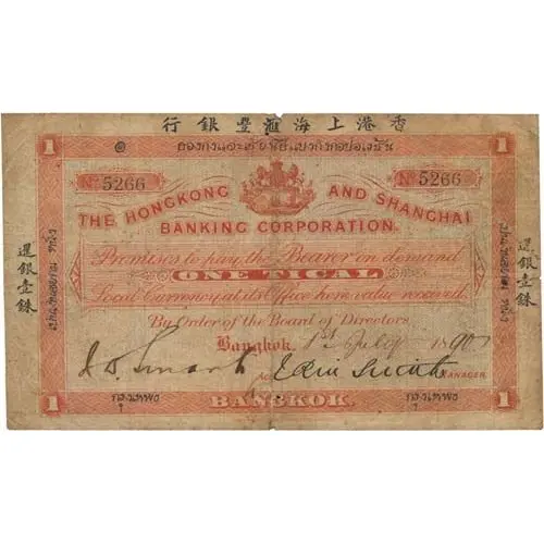 ๑ ๑ ฮองกงและเชียงไฮ้แบงกิงกอปอเรชัน สัญญกว่า เมื่อผู้ ใด หนึ่ง } ได้นํฃหนังสือสำคัญฉบับนี้ มายื่นทิ่ห้างข้าทเจ้าในหัวเมืองนี้แล้ว ฃา้ทเจา้จะใช้ เงินให้แก่ผู้นั้นในทันใด เปนเงินสยาม หนึ่ง บาท โดยบัญท่แห่งผู้บังคัปการนี้ กรุงเทพฯ ๑ ๑ |
