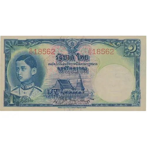 | Obverse lettering | รัฐบาล ไทย ธนบัตร์เป็นเงินที่ชำระหนี้ได้ตามกฎหมาย หนึ่งบาท รัฐมนตรีว่าการกระทรวงการคลัง THOMAS DE LA RUE & COMPANY LIMITED, LONDON. (Translation: Government of Thailand Banknote is legal tender, could be used as silver to pay debt by the law One Baht Minister of Finance) |