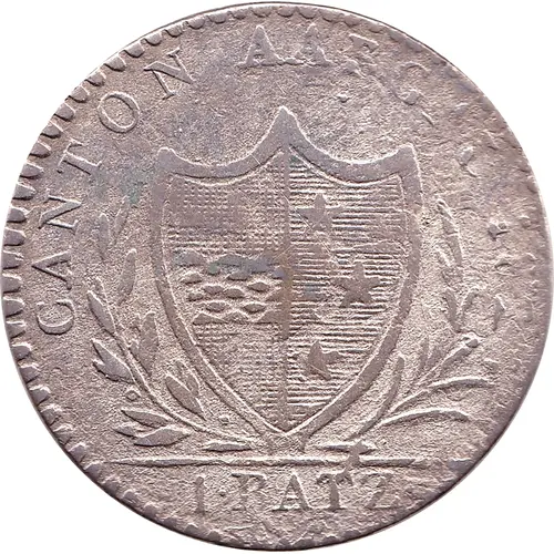 Technical/Grading: Struck in billon, this denomination often exhibits characteristics typical of mass-produced fractional coinage. Key high-points for wear and strike analysis include the raised elements of the Aargau shield on the obverse, particularly the stars and the crests of the wavy lines. On the reverse, the lettering of the denomination and date, along with the details of the surrounding wreath, are critical areas. Strikes can vary, with peripheral legend weakness and occasional planchet imperfections being common, requiring careful assessment for higher grades.