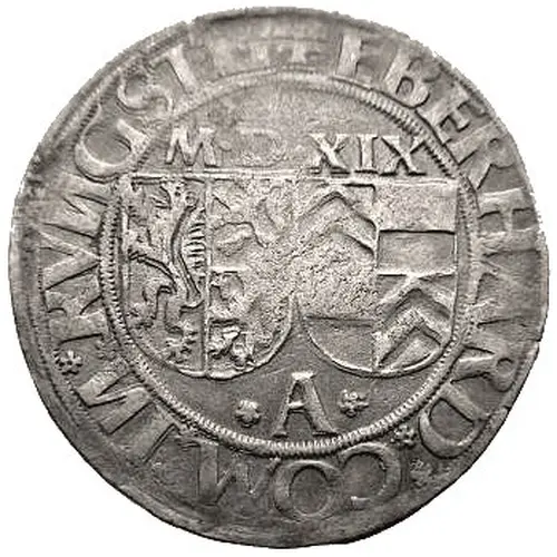 | Obverse description | 2 adjacent shields of arms, 2-fold on left and 4-fold on right, R.N. date above, `A` below, titles of Eberhard IV. |