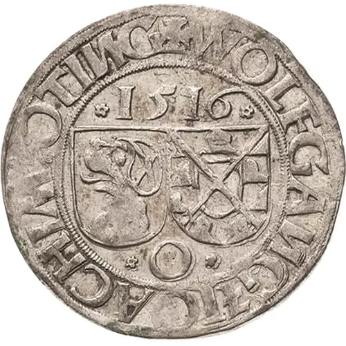 | Obverse description | 2 adjacent shields of arms, dog`s head on left, Öttingen on right, date above. O` below, titles of counts Wolfgang I and Joachim in legend |