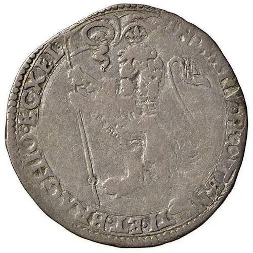 | Ön yüz açıklaması | Circular legend surrounded by beading, a rampant lion to the left with a lily on its head holding a banner fluttering in the wind. |