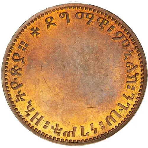 Historical Context: This 1 Birr pattern coin from 1892 marks a pivotal era under Emperor Menelik II. Ascending in 1889, Menelik II unified Ethiopia, initiated modernization, and fiercely defended its sovereignty against European colonial ambitions. The Birr's introduction as the national currency was crucial for establishing a modern monetary system. This bronze pattern likely represents an experimental phase, exploring new denominations or alternative metals, reflecting Menelik's efforts to assert independence.