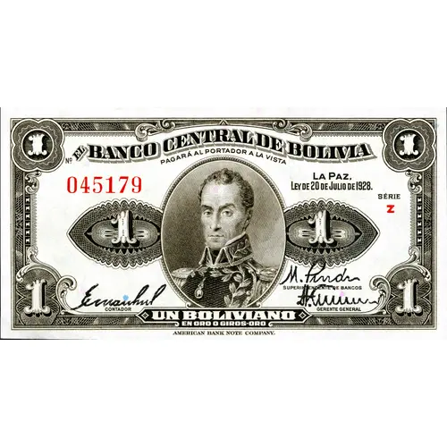 El Banco Central de Bolivia La Paz, Ley de 20 de Julio de 1928. Pagará al portador a la vista Un Boliviano en oro o giros - oro (Translation: The Central Bank of Bolivia La Paz, Law of July 20, 1928. Will pay the bearer on demand A Boliviano in gold or money - gold) |