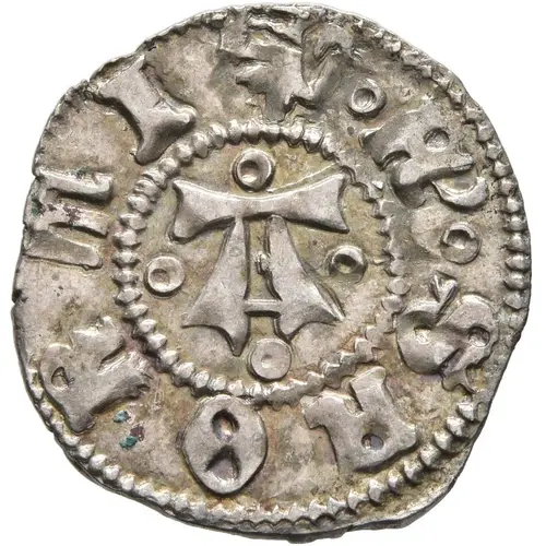 Mô tả mặt trước Large gothic A surrounded by four small rings, within reeded inner circle. Arms of Sforza above.