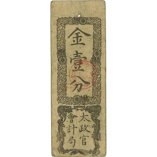 | Obverse lettering | 金壹分 信 太政官 會計局 (Translation: Gold one Bu Trust Great Council of State Accounting Office) |