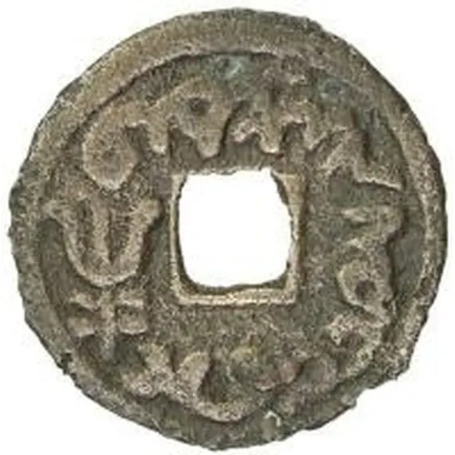 | 正面描述 | Sogdian legend surrounding the hole with trident-like tamgha of the Tukhus to the left. |
