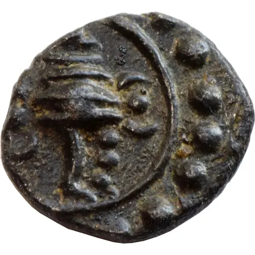 | Beschrijving keerzijde | Shiva Lingam flanked by sprays in circle, surrounded by beads, date below |