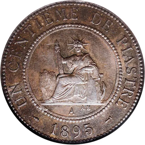 Artistry: The coin's design reflects the neoclassical academic style prevalent in late 19th-century French numismatics, typically from Paris Mint engravers. The obverse depicts a seated allegorical figure of France or Liberty, holding a fasces and rudder, symbolizing republican authority and maritime power. The reverse features the "1 CENT" denomination within a laurel and oak wreath, signifying victory and strength, with the "1895" date below. This iconography projected French republican ideals and colonial dominion.