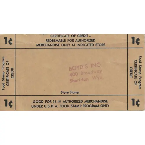 | Vorderseitenlegende | 1¢ CERTIFICATE OF CREDIT - 1¢ REDEEMABLE FOR AUTHORIZED MERCHANDISE ONLY AT INDICATED STORE Food Stamp Program CERTIFICATE OF CREDIT BOYD`S INC. 400 BROADWAY SHERIDAN, WYO, Store Stamp Food Stamp Program CERTIFICATE OF CREDIT GOOD FOR 1¢ IN AUTHORISED MERCHANDISE 1¢ UNDER U.S.D.A. FOOD STAMP PROGRAM ONLY 1¢ |