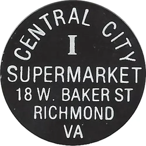 | Obverse lettering | CENTRAL CITY I SUPERMARKET 18W. BAKER ST RICHMOND VA |