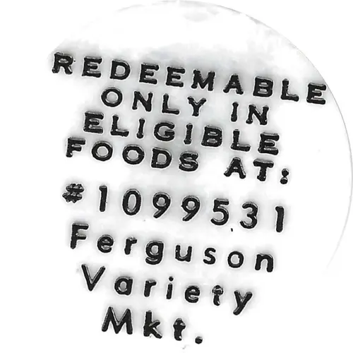 | Obverse lettering | REDEEMABLE ONLY IN ELIGIBLE FOODS AT: Ferguson Variety Mkt. |