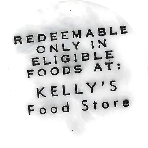 | Obverse lettering | REDEEMABLE ONLY IN ELIGIBLE FOODS AT: KELLY’S Food Store |