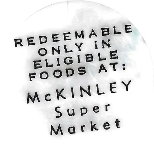 | Obverse lettering | REDEEMABLE ONLY IN ELIGIBLE FOODS AT: McKINLEY Super Market |